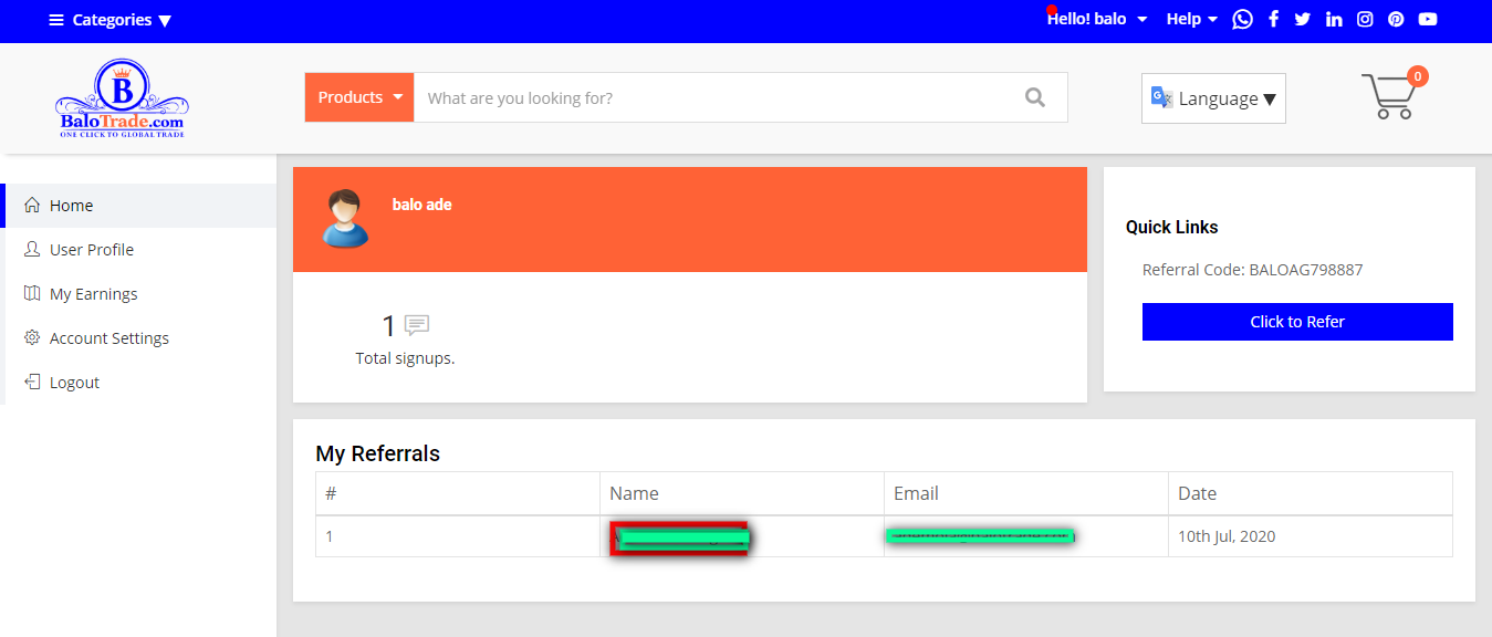 As BaloTrade Sales Agent, there are few reminders you need to take to heart for you to be successful on BaloTrade platform, you need to remember that as an agent it’s required of you to invite users to BaloTrade using your referral link which is located in your dashboard by the left-hand side, we have also added a default invitation message that can also be edited, just click the "Click to Refer" in your agent dashboard to start referring, a user who registered through your referral link, either to buy or sale online gives you an opportunity to earn by any transaction performed.